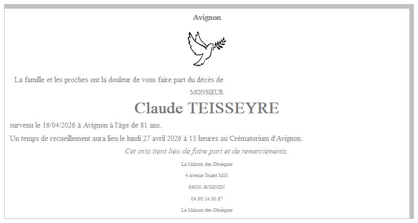 Crématorium d'Avignon le lundi 27 avril à 13 heures 30