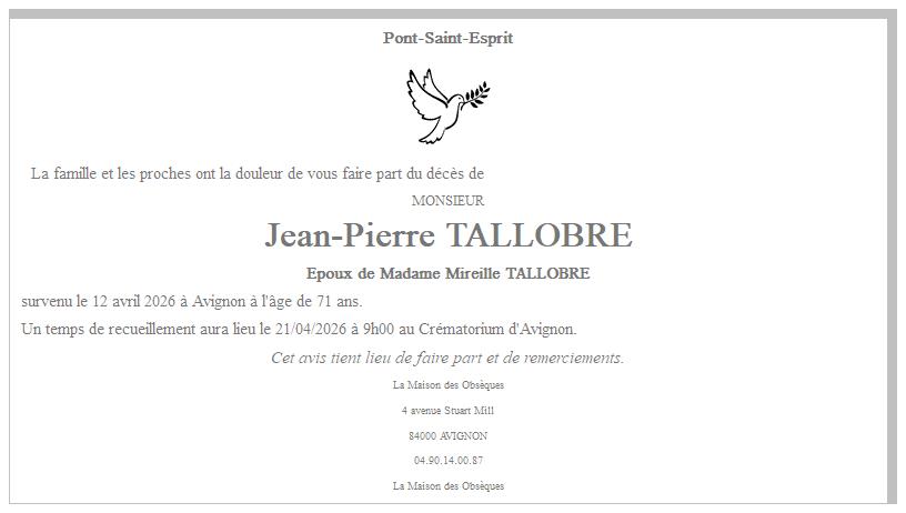 Avis de décès de Monsieur Jean-Pierre TALLOBRE