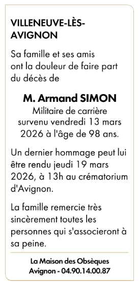 Décédé à Villeneuve-lès-Avignon (30400, France) le vendredi 13 mars 2026 à l'âge de 98 ans